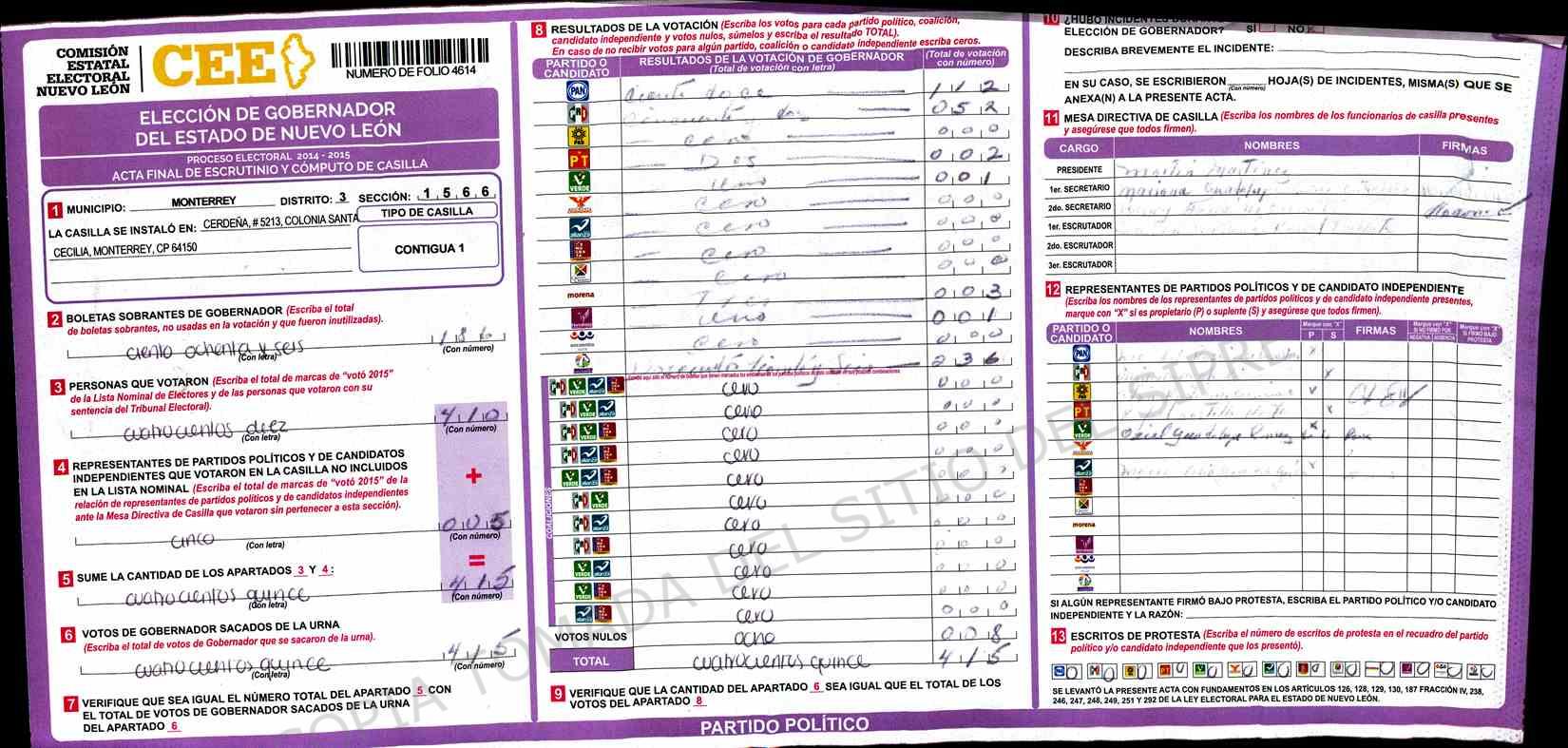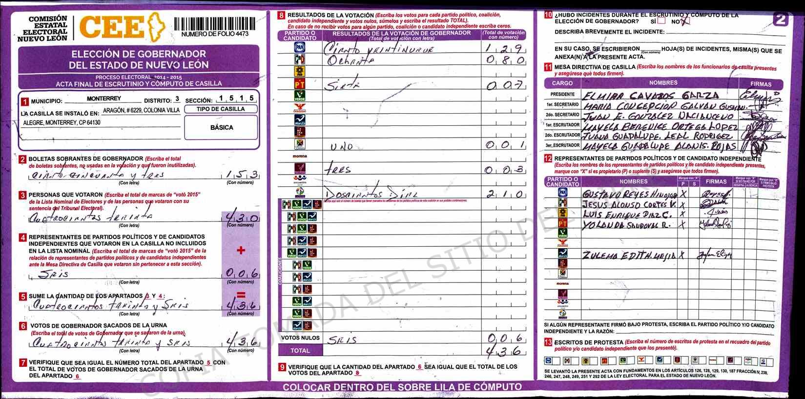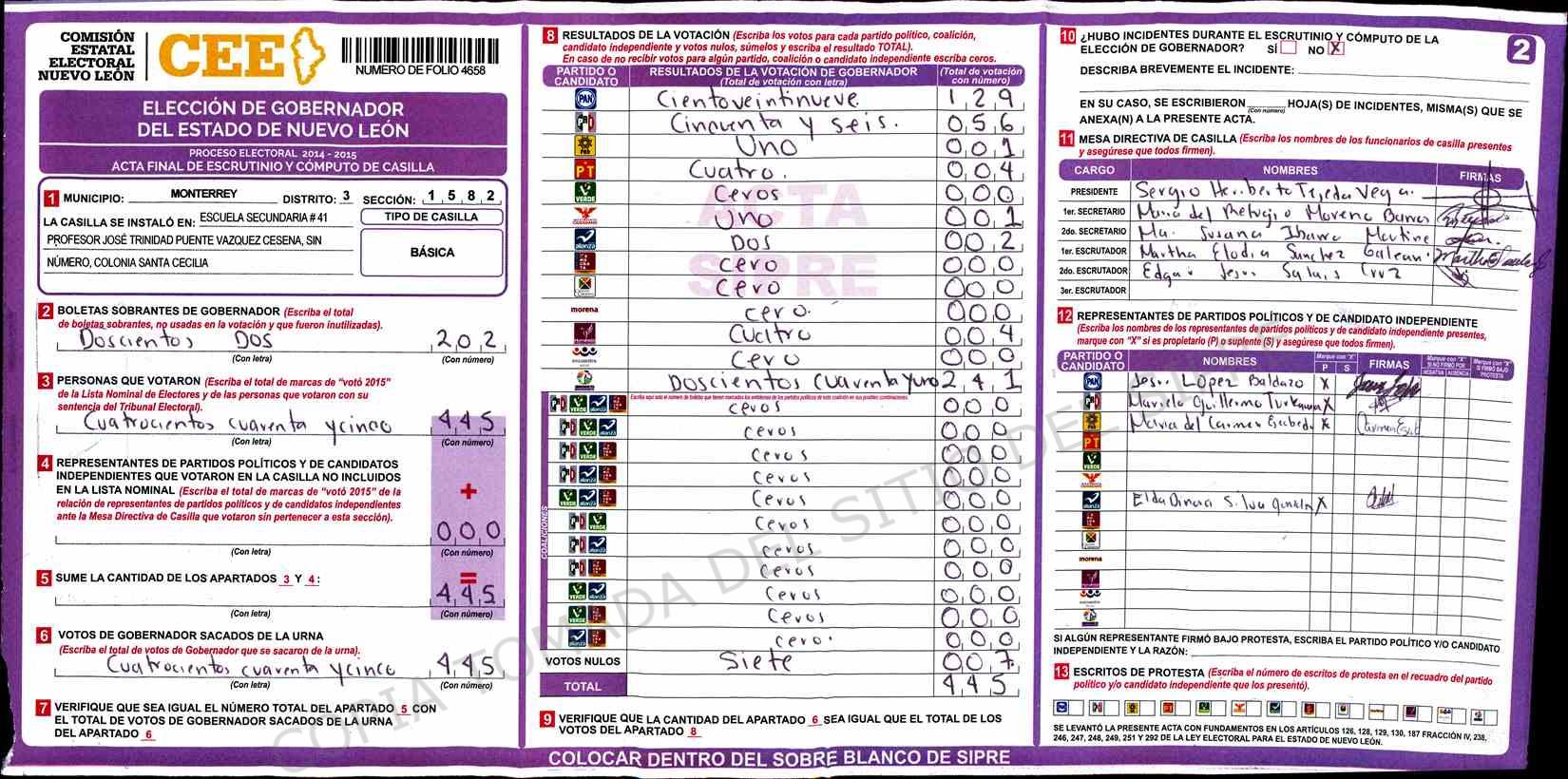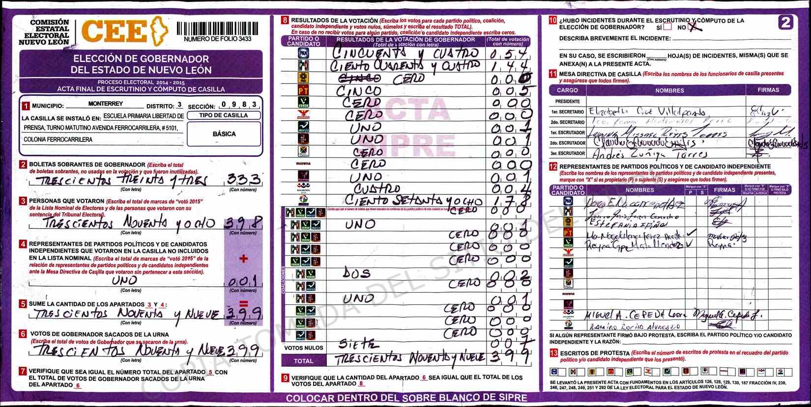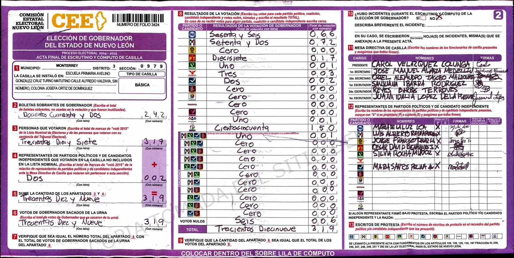 | Claves de Incidencia: | (1) Ilegible, (2) Mutilada, (3) Presenta Correcciones, (4) Presenta Borrones, (5) En Blanco, (6) Cifras Remarcadas, (7) Cifras de Mas, (8) Copiado Movido, (9) Con Signos Inválidos, (10) Excede Lista Nominal, (11) Otra |